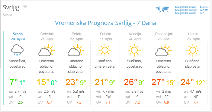 Највиша дневна температура очекује нас у понедељак, 25. априла 2022. године, и то +27 С’.